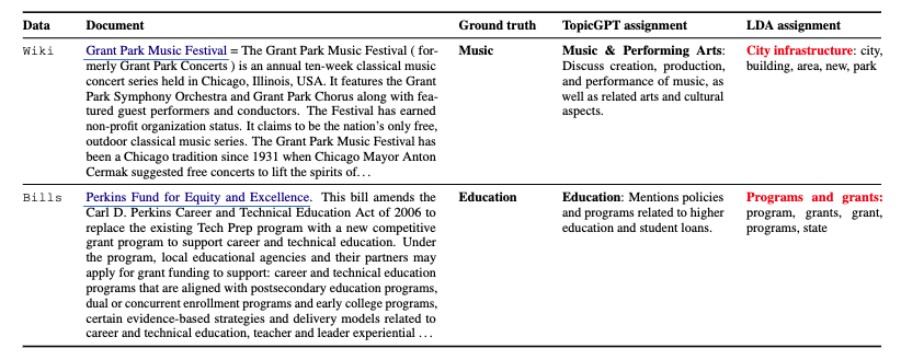 실험에서 TopicGPT는 Wiki와 Bills 데이터셋에서 LDA, BERTopic, SeededLDA와 같은 다른 기준 방법들과 비교하여 월등한 성능을 나타냈습니다. - 주제 할당의 적합성