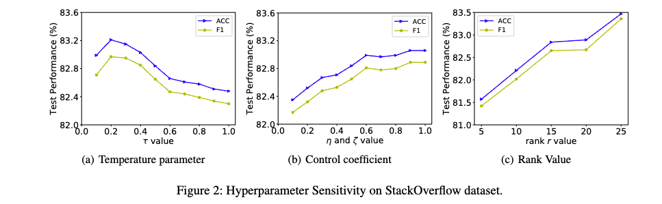 - 하이퍼파라미터 값이 증가함에 따라 결과가 증가하는 경향을 보입니다. η과 ζ가 증가함에 따라 두 종류의 Contrastive Learning (CL)이 최종 손실 함수에 미치는 기여도가 증가하기 때문입니다. 여기서 Contrastive Learning은 데이터 내의 유사성을 학습하는 방법입니다.