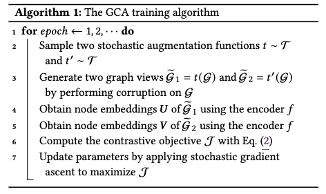 - 대조 손실(Contrastive Loss): GCA는 두 뷰에서 동일한 노드의 임베딩이 서로 일치하도록 장려하고 다른 노드의 임베딩과 구별되도록 하는 대조 손실 함수를 사용합니다. 이를 통해 모델은 뷰 간의 일관성을 학습하고 노드의 중요한 특징을 추출할 수 있습니다.
