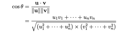- 코사인 유사도(cosine similarity)는 두 벡터의 내적을 각 벡터의 길이(노름, norm)의 곱으로 나눈 값입니다.