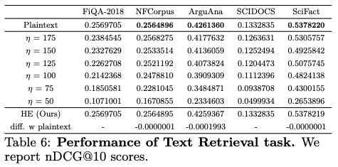 - HE 방식은 STS 결과와 마찬가지로 텍스트 검색에서도 plaintext(개인 정보 보호 기법을 적용하지 않은 원본)와 거의 동일한 성능을 유지했습니다.