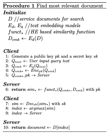 - 서버 측 사전 준비: 검색 문서와 같은 대량의 서버 측 텍스트 임베딩은 미리 계산되어 중앙 집중식 서버에 업로드됩니다. 서비스 제공자는 이 데이터베이스에 접근할 수 있으므로, 서버 측 임베딩은 암호화되지 않은 상태로 가정합니다.