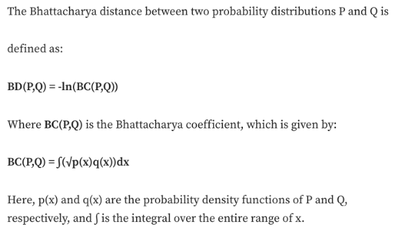 Bhattacharyya 거리는 두 확률 분포 사이의 중첩을 측정하는 강력한 도구입니다. 높은 값은 두 분포 사이의 유사성이 크다는 것을 나타냅니다. Bhattacharyya 거리는 Bhattacharyya 계수의 음의 로그를 취하여 얻는다. Bhattacharyya 거리는 항상 양수이며 0에서 무한대 사이의 범위를 가진다.