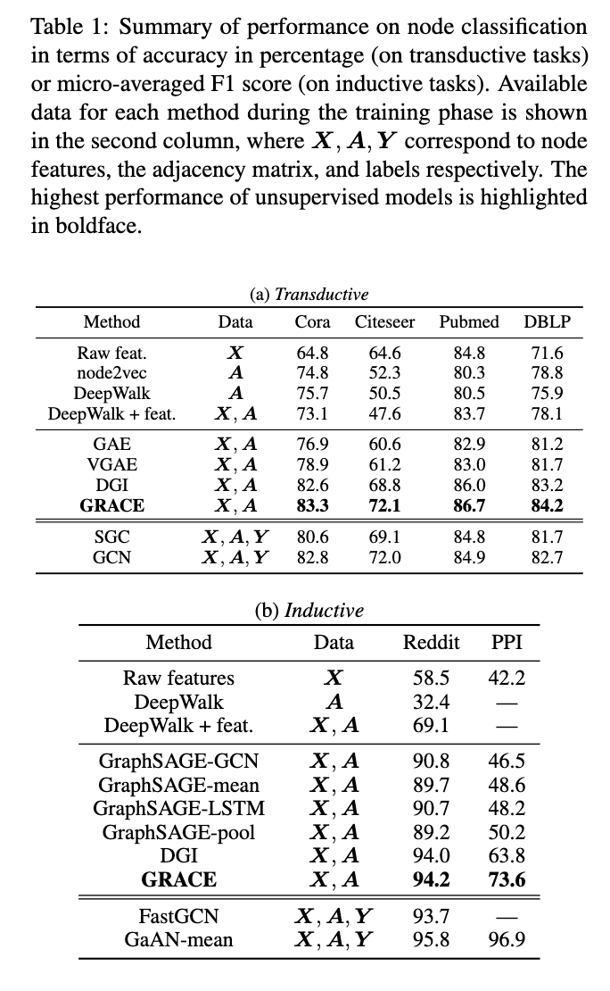 - 기존 unsupervised method 대비 우위: Transductive 및 inductive task 모두에서 GRACE가 기존 unsupervised 모델보다 훨씬 뛰어난 성능을 보였습니다. 이는 GRACE의 contrastive learning framework의 우수성을 입증합니다.