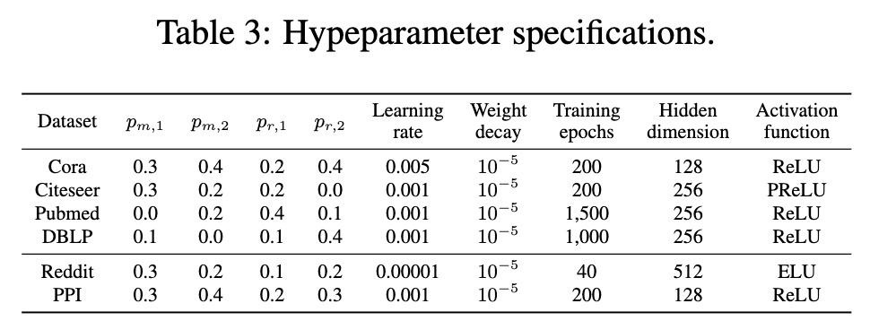 - Reddit 데이터의 규모가 매우 크기 때문에 Deep Graph Infomax에서 사용된 설정을 따릅니다. 3개의 레이어로 구성된 GraphSAGE-GCN (Inductive Representation Learning on Large Graphs) 를 인코더로 사용하며, residual connection 을 추가했습니다.