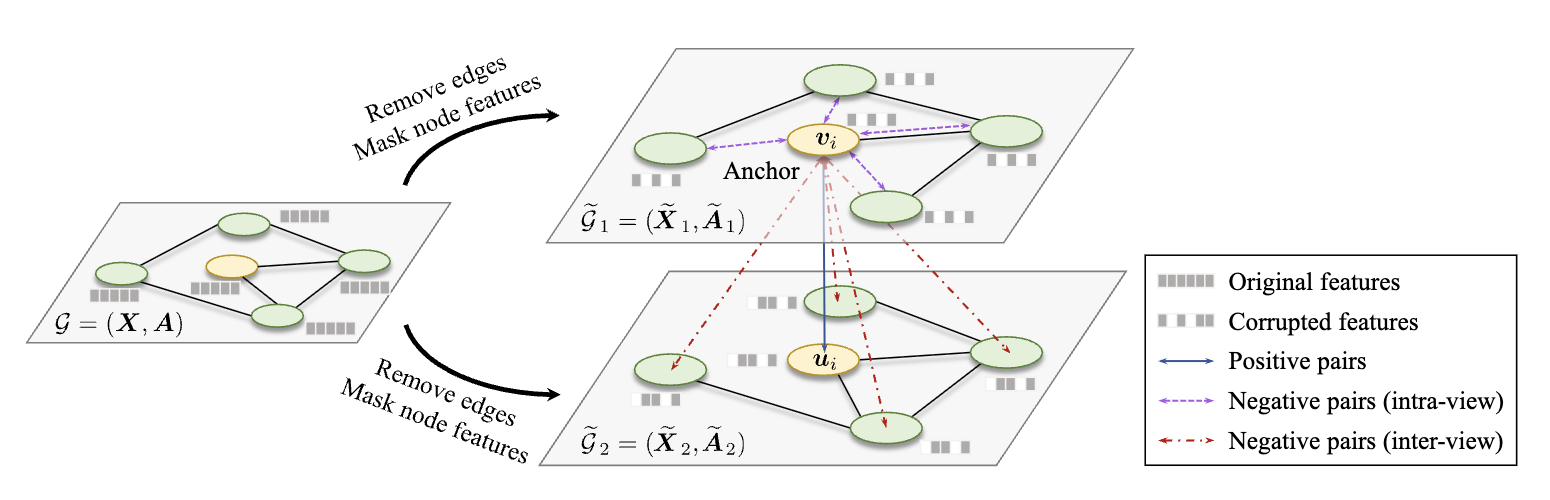 - 그래프 뷰 생성: 엣지 제거(removing edges)와 노드 특징 마스킹(masking node features)이라는 두 가지 방식을 사용하여 그래프 뷰를 생성합니다.
