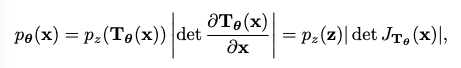 - Change of variables formula: 데이터 x에서의 확률 밀도 pθ(x)는 잠재 변수 z에서의 확률 밀도 pz(z)와 변환 Tθ의 Jacobian 행렬식(determinant of the Jacobian matrix)을 사용하여 계산됩니다.