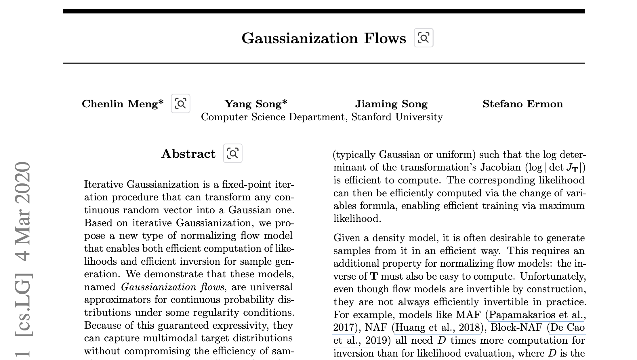 - 이러한 Gaussianization 모듈을 여러 개 쌓아 전체 Gaussianization Flows 모델을 만듭니다. 전체 모델 역시 쉽게 역변환할 수 있습니다.