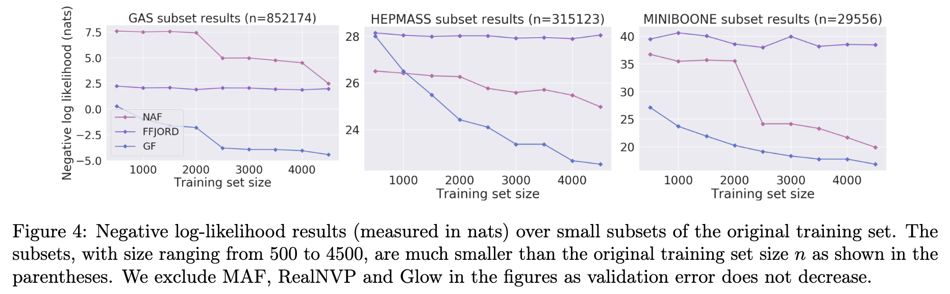 - GF는 FFJORD 및 NAF 모델에 비해 모든 설정(다양한 서브셋 크기)에서 훨씬 뛰어난 성능을 보여주었습니다.