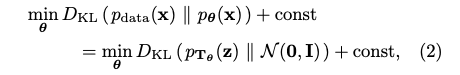 - 이 성질을 이용하면, 실제 데이터 분포 p_{data}(x)와 모델 분포 p_{theta}(x) 사이의 KL Divergence를 최소화하는 문제가 Flow 모델을 통과한 데이터의 분포 p_{T_{theta}}(z))와 목표 분포인 표준 정규 분포 N(0, I) 사이의 KL Divergence를 최소화하는 문제와 동등함을 알 수 있습니다. 수식은 다음과 같습니다.