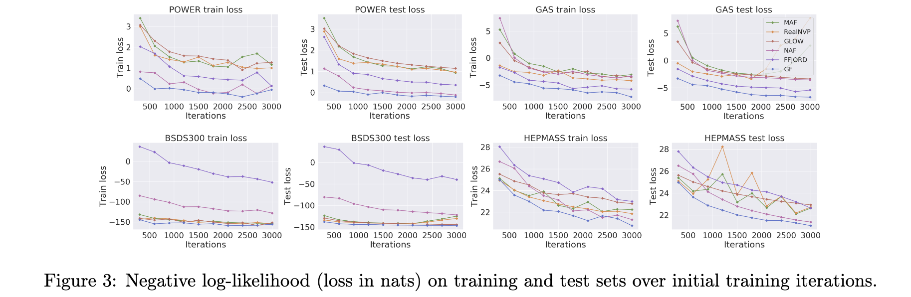 - Figure 3의 실험결과는 훈련 초기 반복(iterations) 동안 GF가 RealNVP, Glow, FFJORD, MAF, NAF와 같은 다른 정규화 흐름(normalizing flow) 모델에 비해 전반적으로 더 나은 훈련 및 검증 성능(더 낮은 음의 로그 가능도, negative log-likelihood)을 달성함을 보여줍니다.