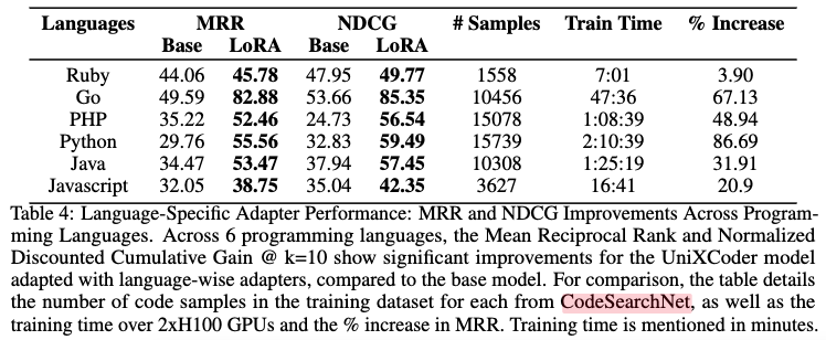 - CosQA 실험 결과를 바탕으로 연구팀은 CodeSearchNet [Husain et al., 2020] 데이터셋의 각 언어별 하위 데이터셋으로 LoRA 어댑터를 언어별로 미세 조정했습니다.