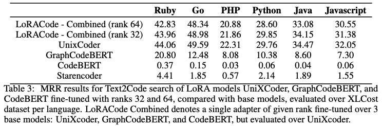 - LoRA 어댑터는 CodeBERT 및 GraphCodeBERT와 같은 임베딩 모델보다 지속적으로 더 나은 성능을 보였습니다. 이는 코드 검색에서 저랭크 적응(low-rank adaptation)의 효과를 입증합니다.