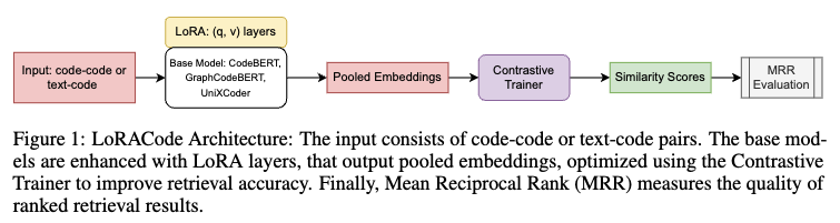 - LoRACode 소개: LoRACode는 Low-Rank Adaptation(LoRA: Low-Rank Adaptation of Large Language Models) 기반의 Parameter-Efficient Fine-Tuning (PEFT) 기법입니다. 이는 기존의 대규모 사전 학습 모델 전체를 미세 조정하는 대신, 모델의 특정 레이어에 소수의 추가 파라미터(low-rank matrices)만 도입하여 학습하는 방식입니다. 논문에서는 이 기법을 코드 임베딩 개선에 적용했습니다.