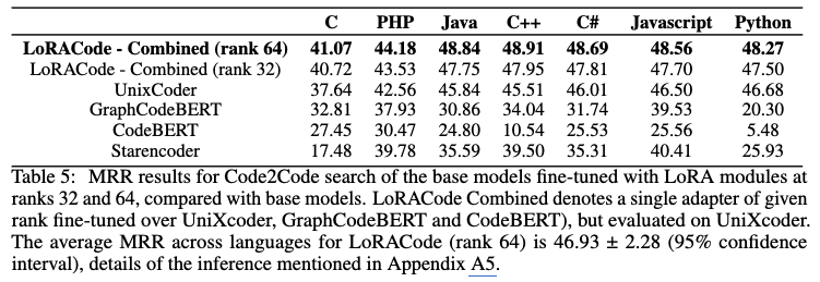 - 다국어 코드 검색 지원: 이러한 결과는 LoRA의 저랭크 분해(low-rank decomposition)가 검색 정확도 향상에 중요한 역할을 하며, 다국어 코드 검색에 이러한 어댑터를 사용하는 것을 지지함을 시사합니다.