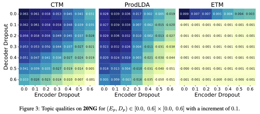 - 이 논문은 VAE-NTM 모델(CTM, ProdLDA, ETM)에서 인코더(encoder)와 디코더(decoder)에 적용된 드롭아웃 비율이 모델 성능에 미치는 영향을 심층적으로 분석했습니다.