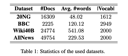 - 데이터셋: 20NG 및 BBC 코퍼스를 사용했습니다.