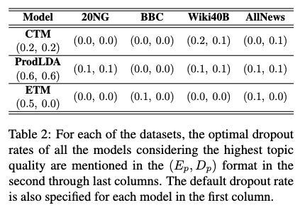 - 이 표는 각 모델(CTM, ProdLDA, ETM)에 대해 사용된 데이터셋별 기본 dropout 비율과 최적 dropout 비율을 보여줍니다.