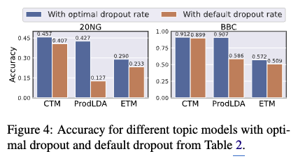 - 실험결과: 최적화된 dropout rate를 사용했을 때 문서 분류 작업의 정확도가 향상되는 것을 확인했습니다 (Figure 4 참고). 이는 적절한 dropout 설정을 통해 토픽 모델이 더 유용하고 예측력 있는 토픽 표현을 학습했음을 시사합니다.