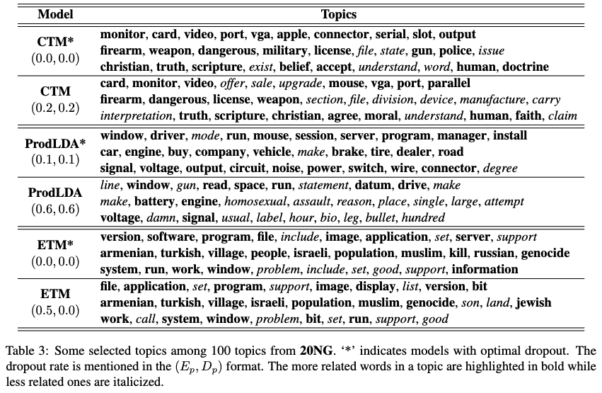 - 본 논문에서의 emperical study 는 드롭아웃 비율을 신중하게 조절하면 VAE-NTM의 성능을 크게 향상시킬 수 있음을 보여줍니다.
