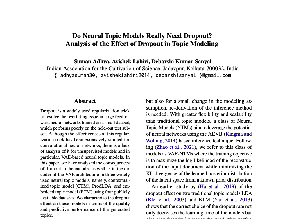 - VAE-NTMs(VAE 기반 뉴럴 토픽 모델)에 dropout을 하이퍼파라미터로 사용하여 성능을 향상시키는 방안을 제안합니다. CTM, ProdLDA, ETM 등 다양한 VAE-NTM 아키텍처에 대해 dropout 효과를 검증했습니다.