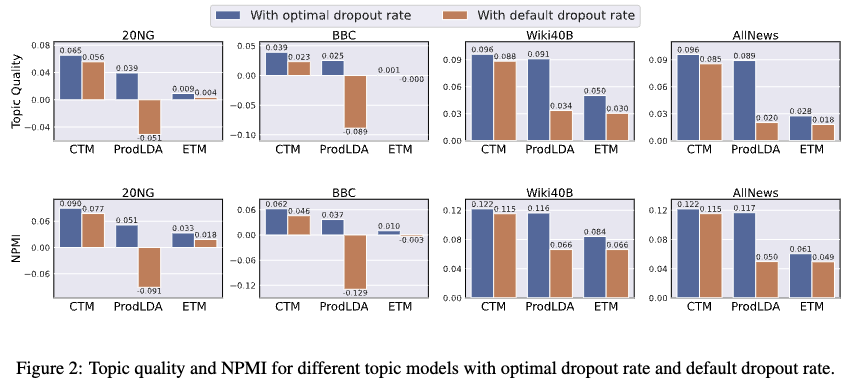 - 다운스트림 작업 성능 향상: VAE-NTM에서 낮은 드롭아웃 비율을 체계적으로 선택하는 것이 문서 분류와 같은 다운스트림 작업의 성능을 상당히 개선할 수 있음을 입증했습니다.
