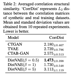 DistVAE는 CorrDist 지표에서 가장 낮은 값을 기록하여, 다른 비교 모델들(CTGAN, TVAE, CTAB-GAN)에 비해 원본 데이터의 상관 구조를 가장 정확하게 보존함을 보여주었습니다 (Table 2 참조).