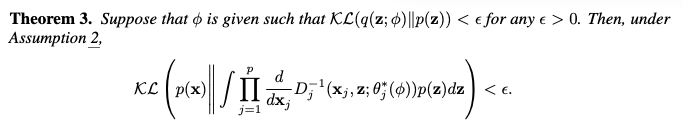 - Theorem 3 은 q(z; phi) 와 p(z) 간의 KL Divergence가 충분히 작을 때, 사전 분포 p(z) 를 사용한 추정된 PDF 역시 실제 분포 p(x)와 가까워질 수 있음을 이론적으로 뒷받침합니다. 이는 사전 분포를 사용하더라도 데이터 분포 학습이 가능하며, 계산 효율적인 합성 데이터 생성이 가능함을 시사합니다.