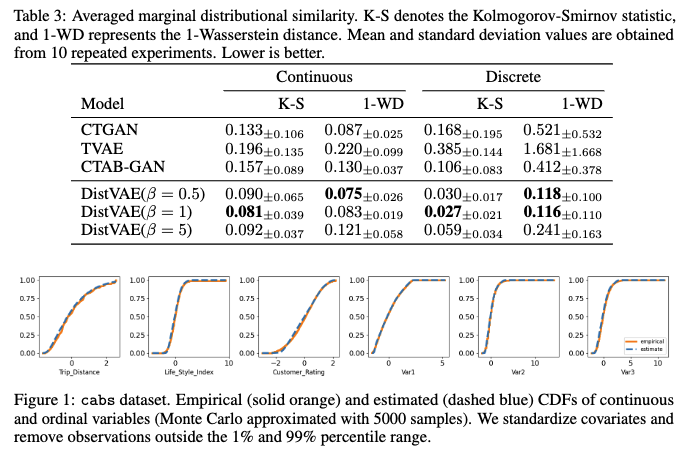 이는 β가 데이터 품질과 개인 정보 보호 수준 간의 균형을 조절하는 역할을 한다는 것을 의미하며, 큰 β 값은 개인 정보 보호 수준은 높이지만 데이터 품질은 낮출 수 있습니다 (Section 4.3.2에서 더 자세히 다룹니다). - 시각적 확인: Figure 1은 cabs 데이터셋의 연속형 변수에 대해 원본 데이터의 경험적 CDF와 DistVAE로 추정된 CDF를 시각화하여 주변 분포 포착 성능을 보여줍니다. Appendix A.10에서는 더 자세한 통계적 유사성 점수와 다른 데이터셋의 CDF 시각화를 제공합니다.