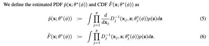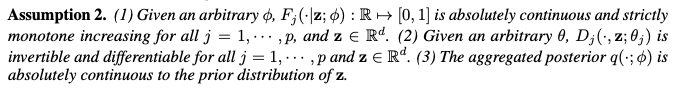 - (1) 주어진 임의의 phi 에 대해, 각 연속 변수 x_j 에 대한 조건부 누적 분포 함수(Conditional Cumulative Distribution Function, CDF) F_j 가 절대 연속(absolutely continuous)이고 모든 j 와 z 에 대해 엄격하게 단조 증가(strictly monotone increasing)함을 가정합니다. 이는 분위수 함수(quantile function)가 잘 정의되고 역함수를 가질 수 있게 합니다.