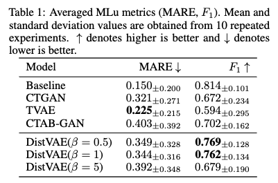 - Baselines: 제안된 DistVAE 모델은 최신 생성 모델인 CTGAN, TVAE, CTAB-GAN 과 비교했습니다.