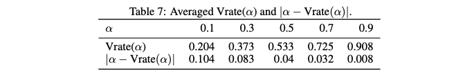 - 논문의 평가 결과: 논문은 Vrate 평가 결과 |α − Vrate(α)| 값를 Table 7에 제시합니다. 표에 따르면, alpha 값이 증가할수록
