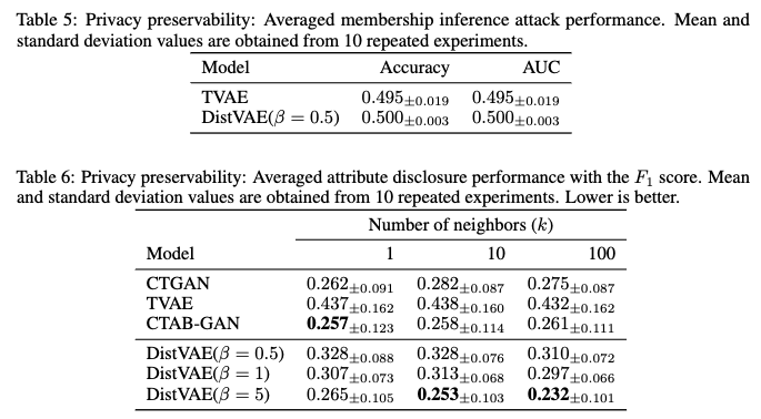 - 결론: Table 6의 결과는 DistVAE가 합성 데이터 생성 시 낮은 수준의 Attribute Disclosure 위험을 가지며, β 값을 조절함으로써 프라이버시 보호 수준을 제어할 수 있음을 나타냅니다.