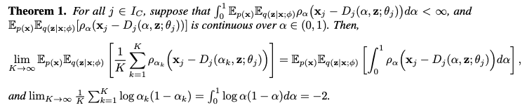 - 유한 혼합 모델과의 연결 (Equation 3) & Theorem 1: 논문은 목적 함수 (2)가 유한 개수의 alpha_k 값을 가진 ALD 혼합 모델의 음수 ELBO를 스케일링한 값의 극한이라는 것을 보여줍니다.