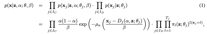 - Decoder 구조 (Equation 1): VAE 모델의 Decoder는 z 와 alpha 가 주어졌을 때 x 를 생성하는 확률 분포를 정의합니다. 가정 1에 따라, 이 분포는 연속 변수와 이산 변수에 대한 조건부 확률의 곱으로 표현됩니다.