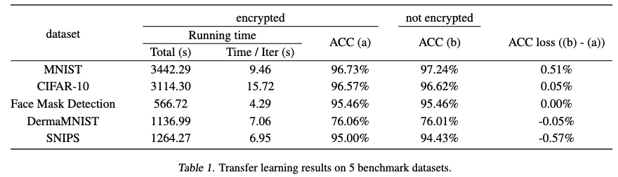 암호화되지 않은 학습과 거의 동일한 분류 정확도를 달성했으며, 암호화된 학습으로 인한 정확도 손실은 최대 0.5%였습니다.
