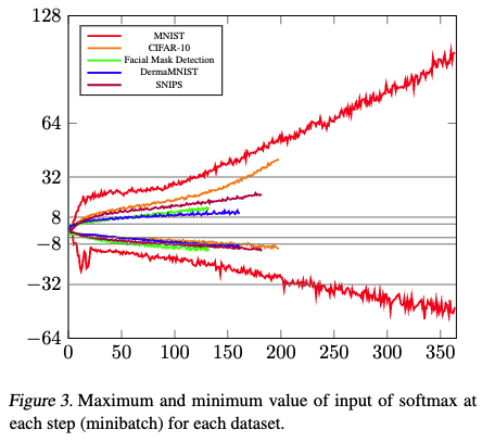 - 동적 입력 범위 처리: Figure 3은 훈련이 진행됨에 따라 소프트맥스 함수의 입력값이 어떻게 변화하는지 보여줍니다. 특히, 입력값은 두 자릿수(예: MNIST 데이터셋에서 0.38에서 100 이상으로 변화)로 증가하는 경향을 보입니다. 기존의 근사 방법들은 이러한 동적으로 변화하는 넓은 입력 범위를 처리할 수 없었기 때문에, 원하는 만큼 많은 에포크(epoch) 동안 모델을 훈련하기 어려웠습니다. HETAL의 새로운 근사 방법은 이러한 한계를 극복하여 훈련의 실용성을 높였습니다.