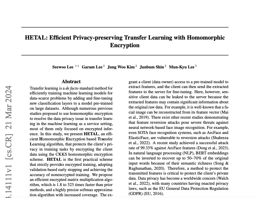 - HETAL은 동형암호(Homomorphic Encryption, HE) 기반의 효율적인 전이 학습(Transfer Learning, TL) 알고리즘입니다.