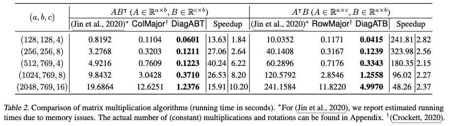 - 예시: A ∈ R^(2048×769)와 B ∈ R^(16×769) 크기의 행렬에 대한 AB^T 계산에서, ColMajor 알고리즘은 784번의 곱셈과 8703번의 회전이 필요하여 회전이 전체 비용의 약 90%를 차지했습니다. 이는 회전 연산의 수가 전체 실행 시간에 미치는 영향이 매우 크다는 것을 보여줍니다.