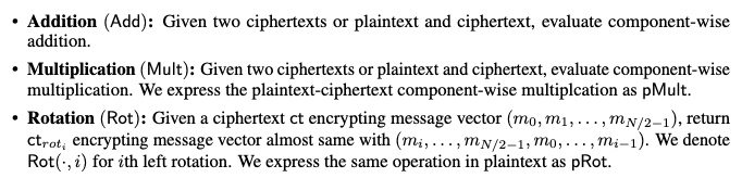 - HE는 다항식 연산만 지원하므로, 나눗셈, max 함수, exp 함수 등과 같은 비-다항 함수는 다항식으로 근사해야 합니다.