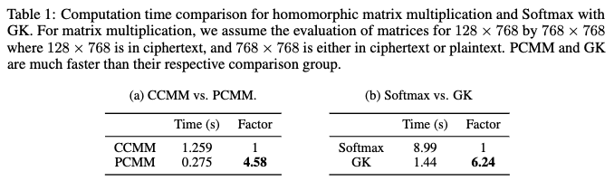 - CKKS 동형암호 스킴을 사용하여 암호화된 데이터로 수정된 BERT 모델을 실험한 결과, Fine-tuning에서 6.94배, 추론에서 2.3배의 상당한 계산 속도 향상을 달성했습니다.