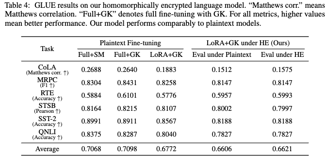 5.3 DOWNSTREAM TASK PERFORMANCE ON ENCRYPTED LANGUAGE MODELS