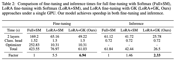 - Table 2: 이 표는 논문에서 제안하는 다양한 LLM 설정(Full+SM, LoRA+SM, LoRA+GK)에 대한 미세 조정(fine-tuning) 및 추론(inference)에 소요되는 시간을 비교 분석합니다.