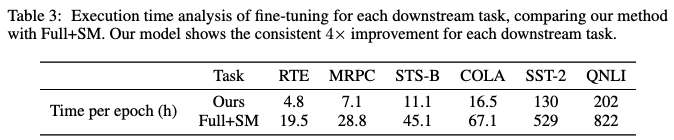 - 제안하는 모델은 모든 다운스트림 작업에서 Full+SM 모델 대비 일관되게 약 4배의 속도 향상을 보여주었습니다.