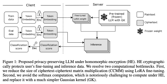 - 본 연구의 기여 (Beyond inference): 이 논문은 LoRA 미세 조정과 가우시안 커널(Gaussian Kernel)을 활용하여 이러한 계산 병목 현상을 해결하고, 개인화된(개인) 미세 조정 후 추론에 중점을 둔 동형 암호(HE) 친화적인 트랜스포머 아키텍처를 제안하여 미세 조정의 문제를 해결합니다.