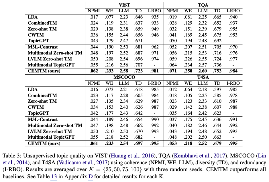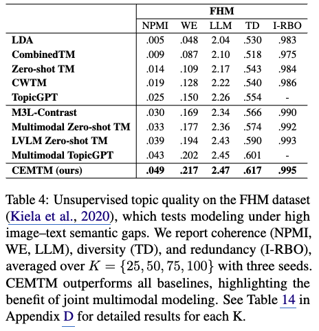- 효율성: 이러한 접근 방식 덕분에 CEMTM은 토픽 표현을 학습하는 과정에서 모달리티 정렬(modality alignment)을 별도로 학습할 필요가 없습니다. 이는 LVLM이 이미 텍스트와 이미지의 의미를 효과적으로 통합하여 표현하기 때문에, 추가적인 정렬 단계 없이도 높은 수준의 교차-모달 이해를 달성할 수 있음을 의미합니다.