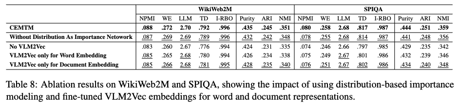 - VLM2Vec only for Document Embedding: VLM2Vec을 최종 문서 임베딩에만 사용하고, 단어 토큰 임베딩에는 다른 방식을 사용한 경우입니다. 이 역시 원본 CEMTM보다는 성능이 떨어지지만, 'No VLM2Vec'보다는 나은 중간 정도의 성능을 보였습니다.