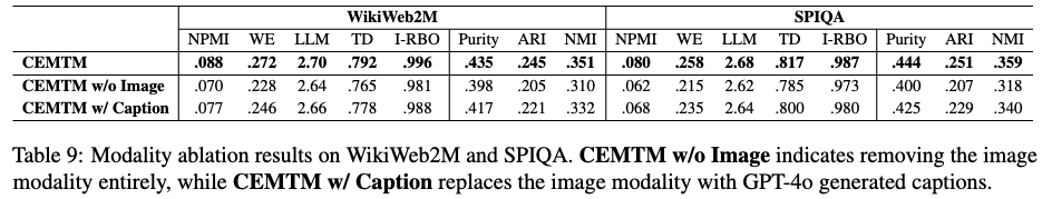 - WikiWeb2M 및 SPIQA 데이터셋에서 이미지 모달리티를 완전히 제거했을 때(CEMTM w/o Image), CEMTM 모델의 성능이 토픽 일관성(topic coherence) 및 클러스터링 품질(clustering quality)을 포함한 모든 평가 지표에서 상당히 저하되었습니다.