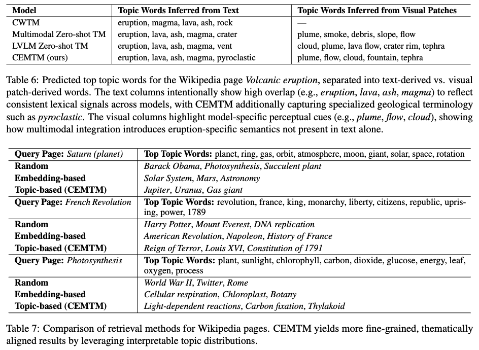 - 활용 분야: CEMTM은 확장 가능(scalable)하고 설명 가능한(explainable) 프레임워크로서, 소수 학습 검색(few-shot retrieval), 멀티모달 요약(multimodal summarization), 그리고 말뭉치 수준의 토픽 분석(corpus-level topic analysis)과 같은 다양한 작업을 효율적이고 해석 가능하게 수행할 수 있습니다.