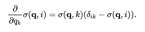 소프트맥스 함수는 미분 가능하기 때문에 훈련을 위해 역전파에 의존하는 신경망에 사용하기에 이상적입니다. 특히, 입력에 대한 소프트맥스 함수의 미분은 다음과 같이 함수 자체로 표현할 수 있습니다.